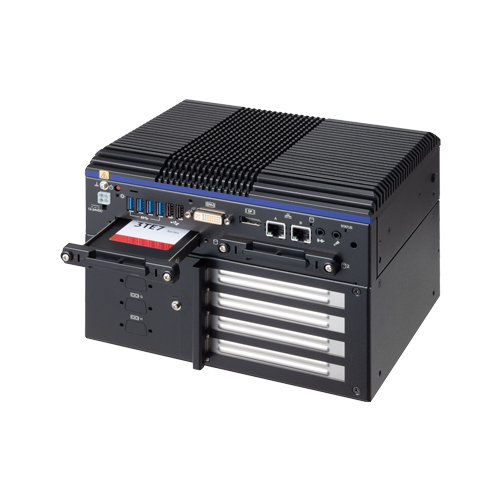 DVI-I×1、DisplayPort×1、2.5GBASE-T×2、USB 3.2 Gen2 (USB 3.1)×4、USB 2.0×2、シリアル(RS-232C)×4(1ポートはRS-422A/485切り替え可能)、DIO×1などの拡張インターフェイスを搭載しています。また、スロットイン方式の2.5インチSATAディスクスロットを2スロット搭載しており、OSとデータの分離が可能で一方をシステム起動用、もう一方をメンテナンス用やシステムログ/収集したデータの持ち帰り用といった運用形態がとれるため、たいへん便利です。